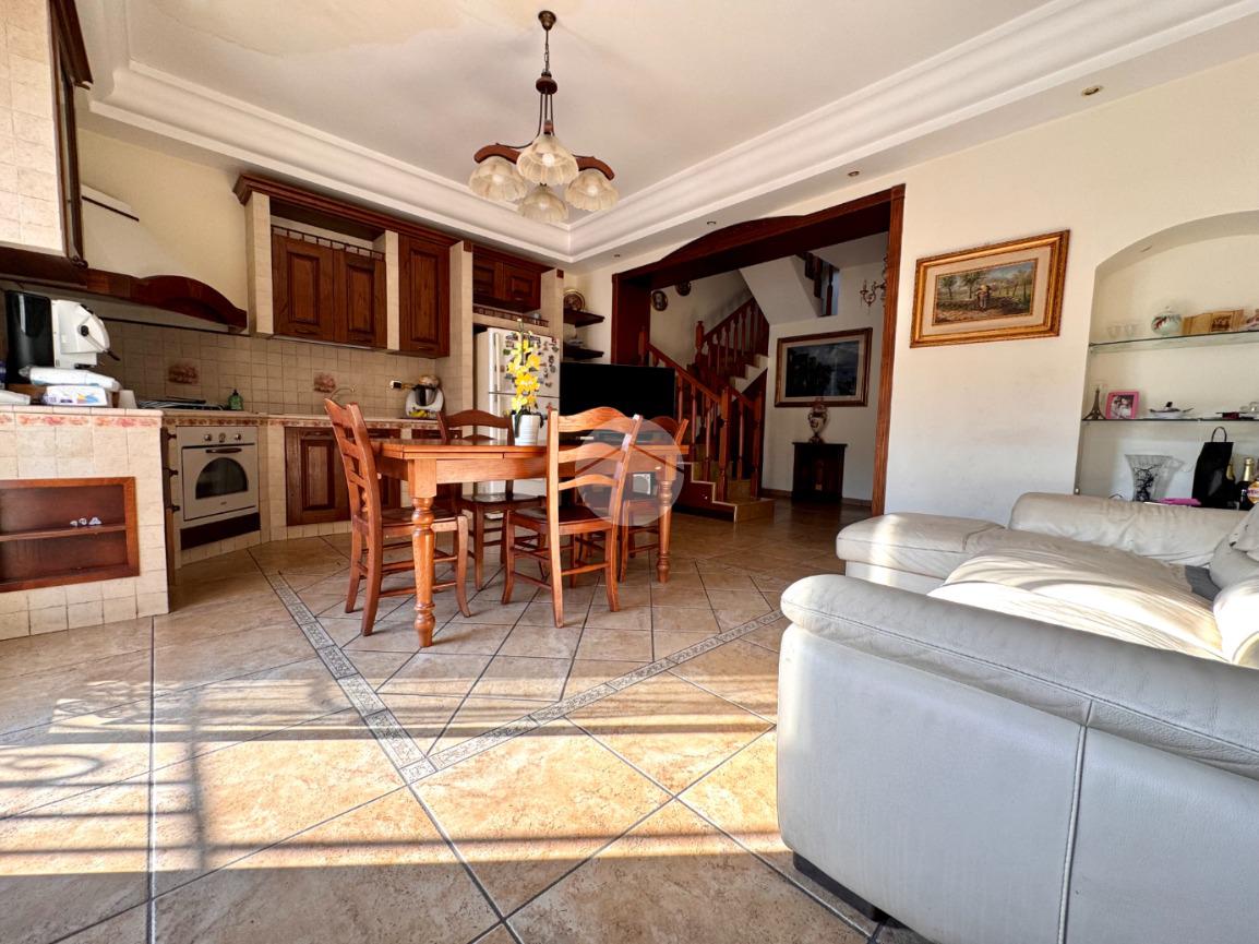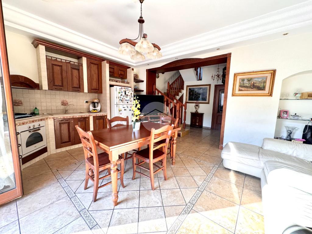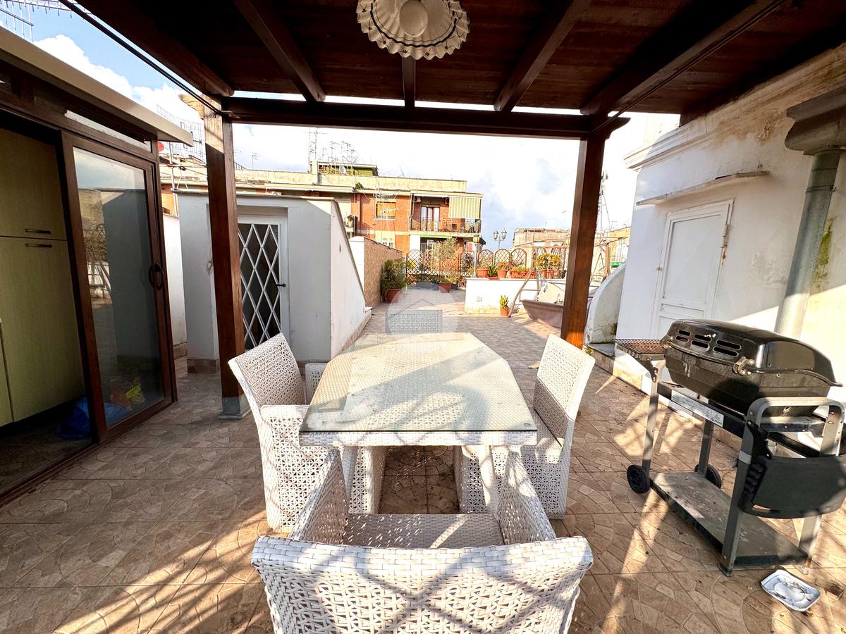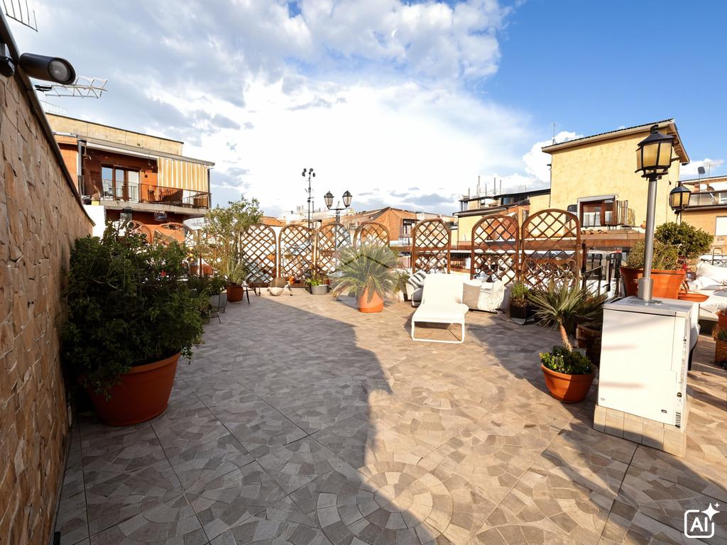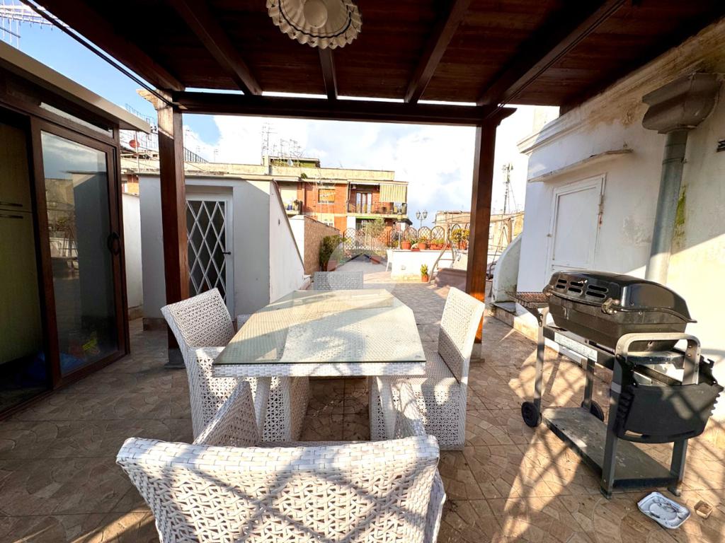 Il terrazzo è inoltre dotato di tettoia con cucina o angolo cottura, perfetto per organizzare pranzi, cene o momenti conviviali all’esterno sfruttando appieno questo spazio.